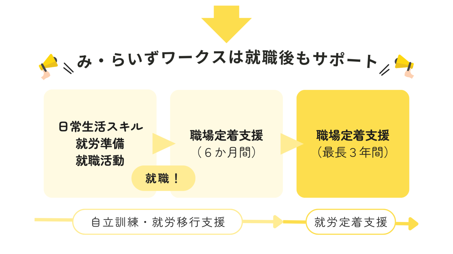 | プログラム(3〜5日間) | 事務作業や清掃、軽作業、製造業など、就職先の業務から独自に開発した体験用のワークサンプルに取り組みます。 その他、法人内のイベント運営や企業見学等を通し、「働く現場」での体験もできます。※時期や利用日数によって異なります。 |